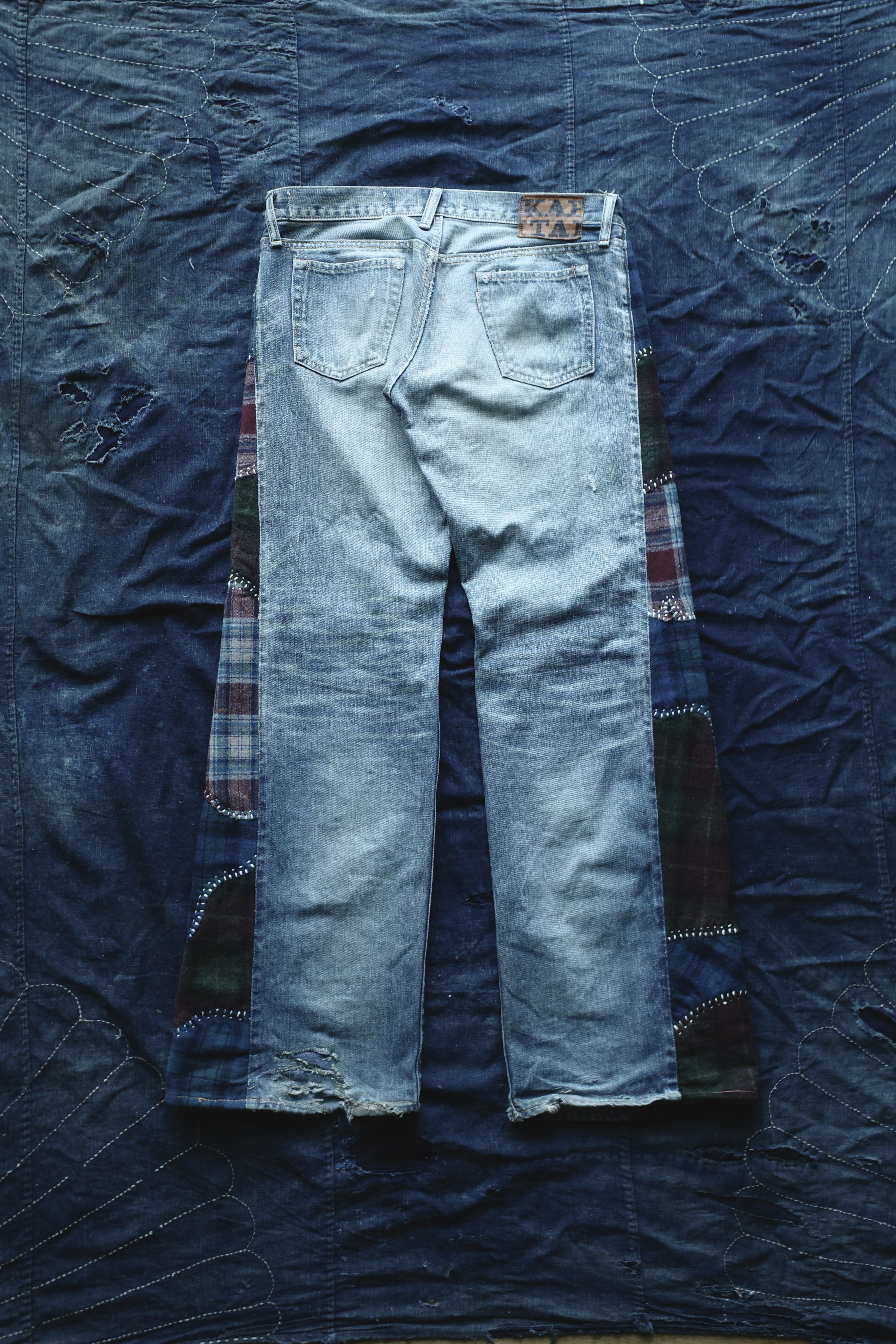 Custom-made Kapital denim jeans with hand-stitched side-seam detailing that I designed and fabricated for Kai Cenat and the Tone x Target Campaign.